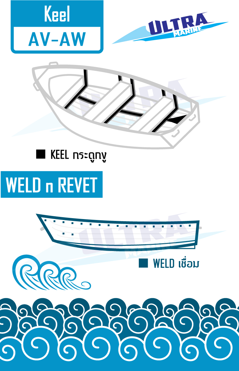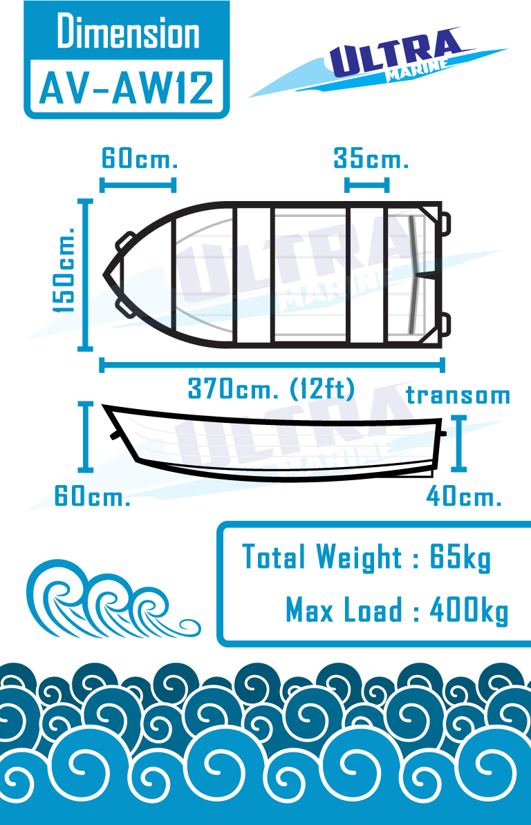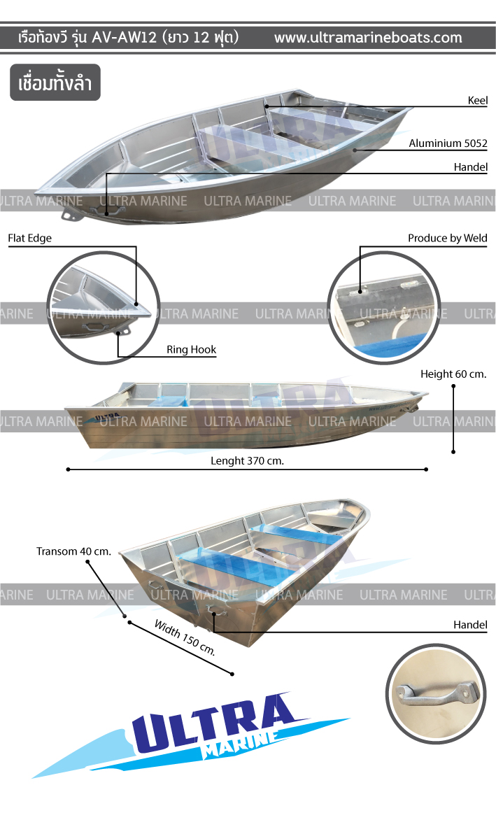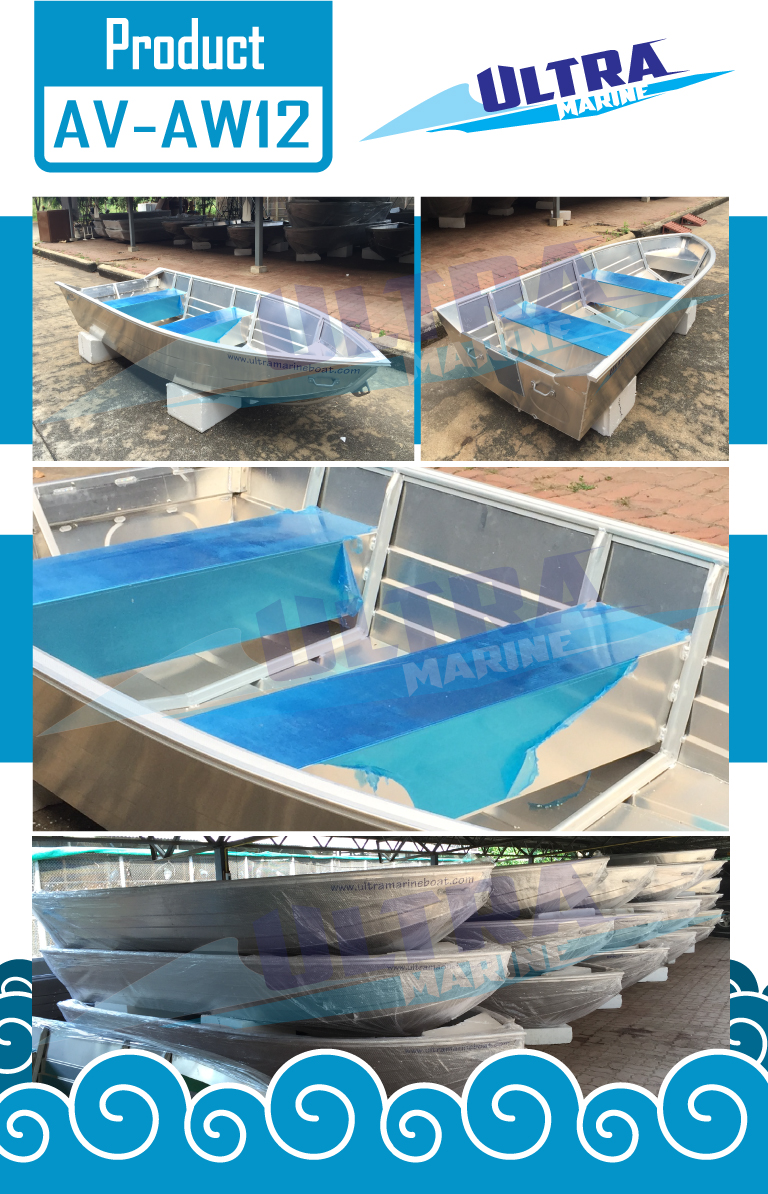 เรืออลูมิเนียม Ultramarine  รุ่น AV-AW12 ผลิตด้วยอลูมิเนียมเกรด AA5052  มีความแข็งแรง ทนทาน ราคาถูก ผลิตจากโรงงานที่ได้รับความนิยมในประเทศต่าง ๆ ทั่วโลก เหมาะกับเรือกู้ภัย เรือตกปลา เรือท่องเที่ยว